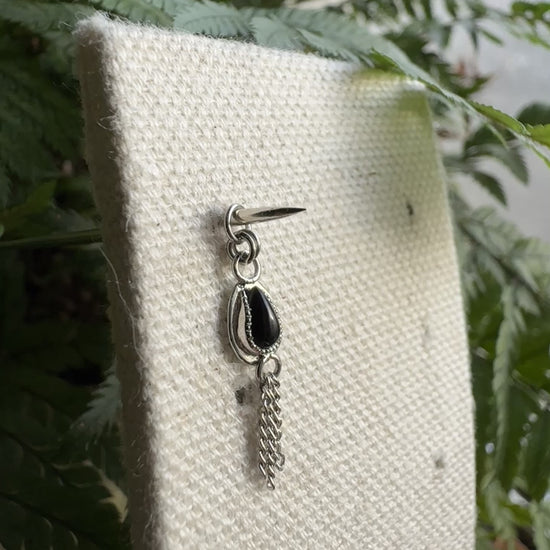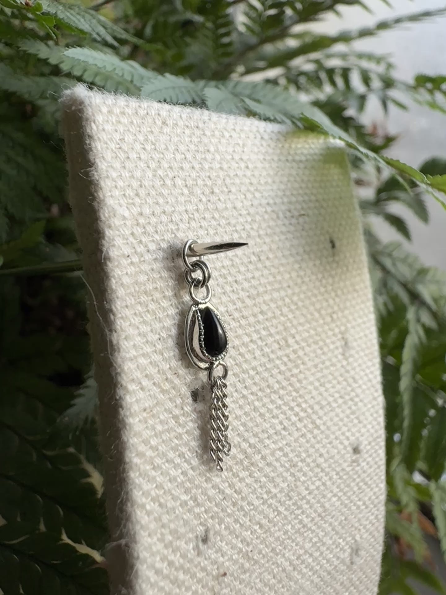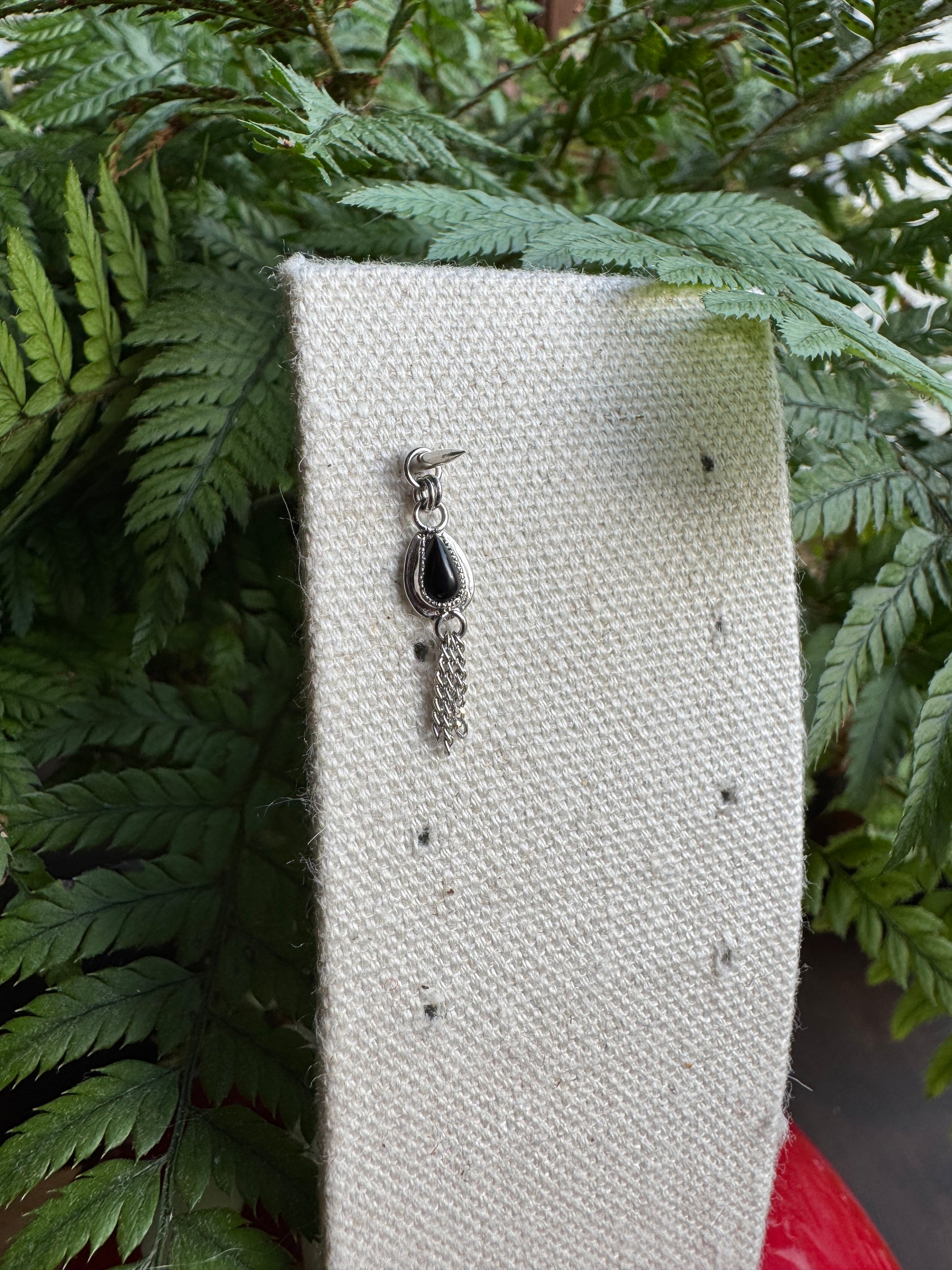 A beautiful platinum bezel set black onyx pear with milgrain surround and high polished halo cut with a little whippy whip tassel bottom