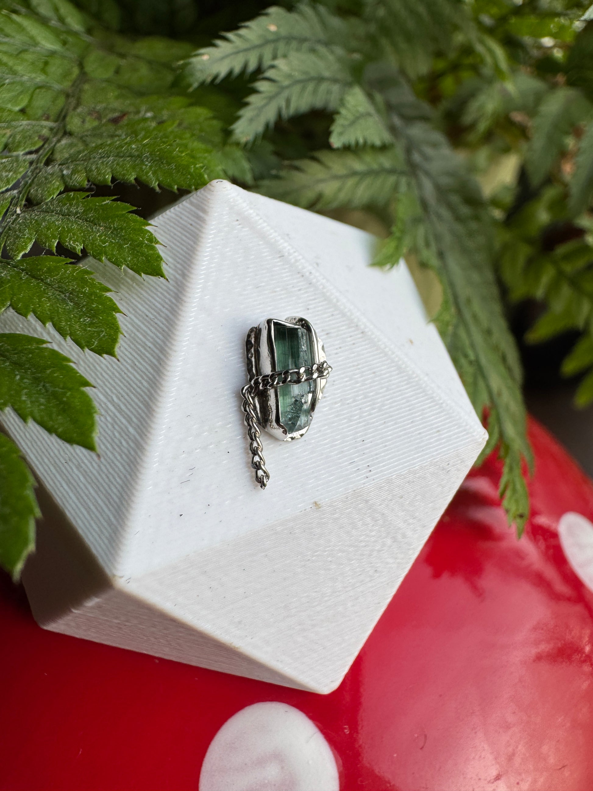 A solid platinum bezel set raw green tourmaline with a hammered textured peekaboo, fine wire belt and little chain drape