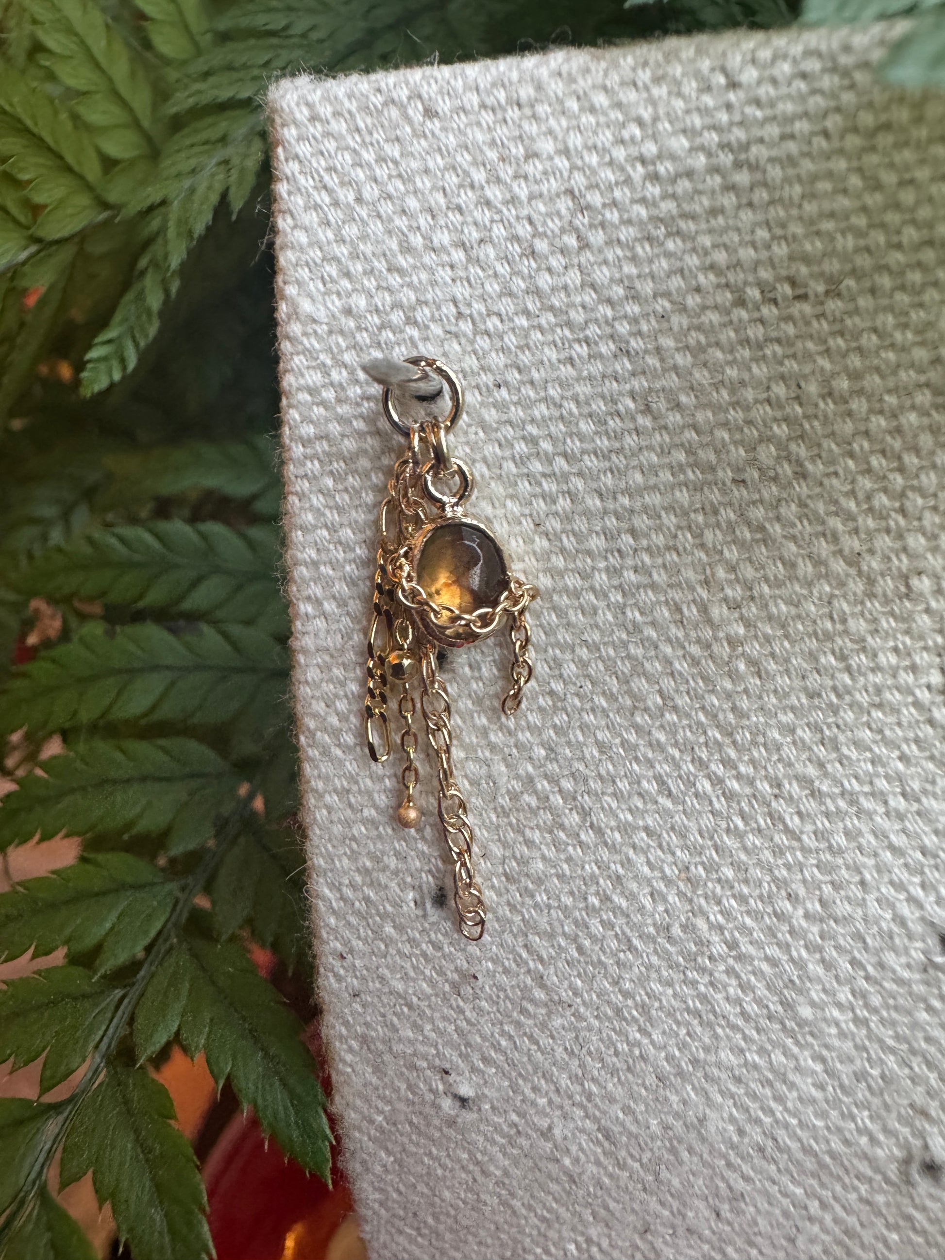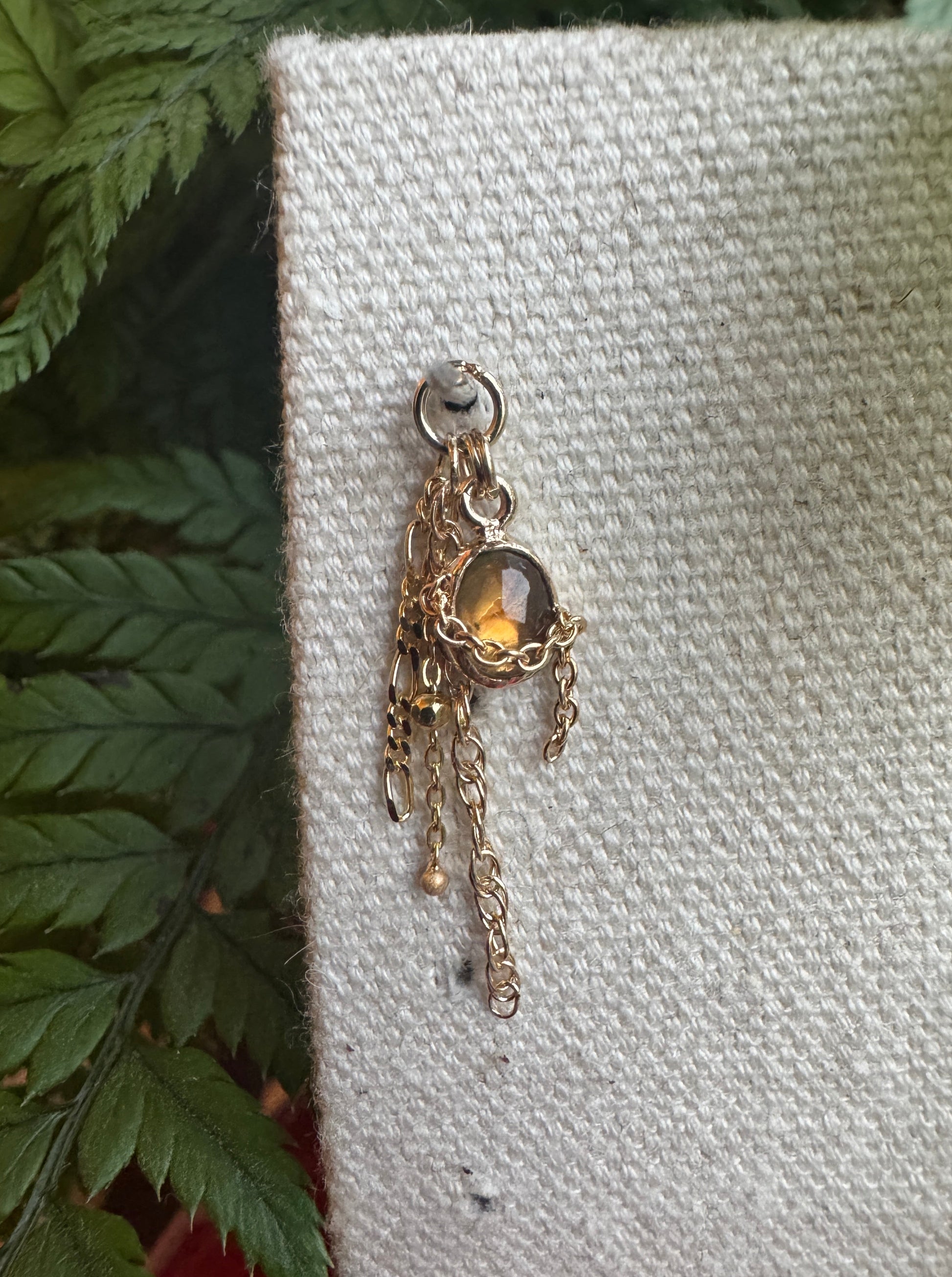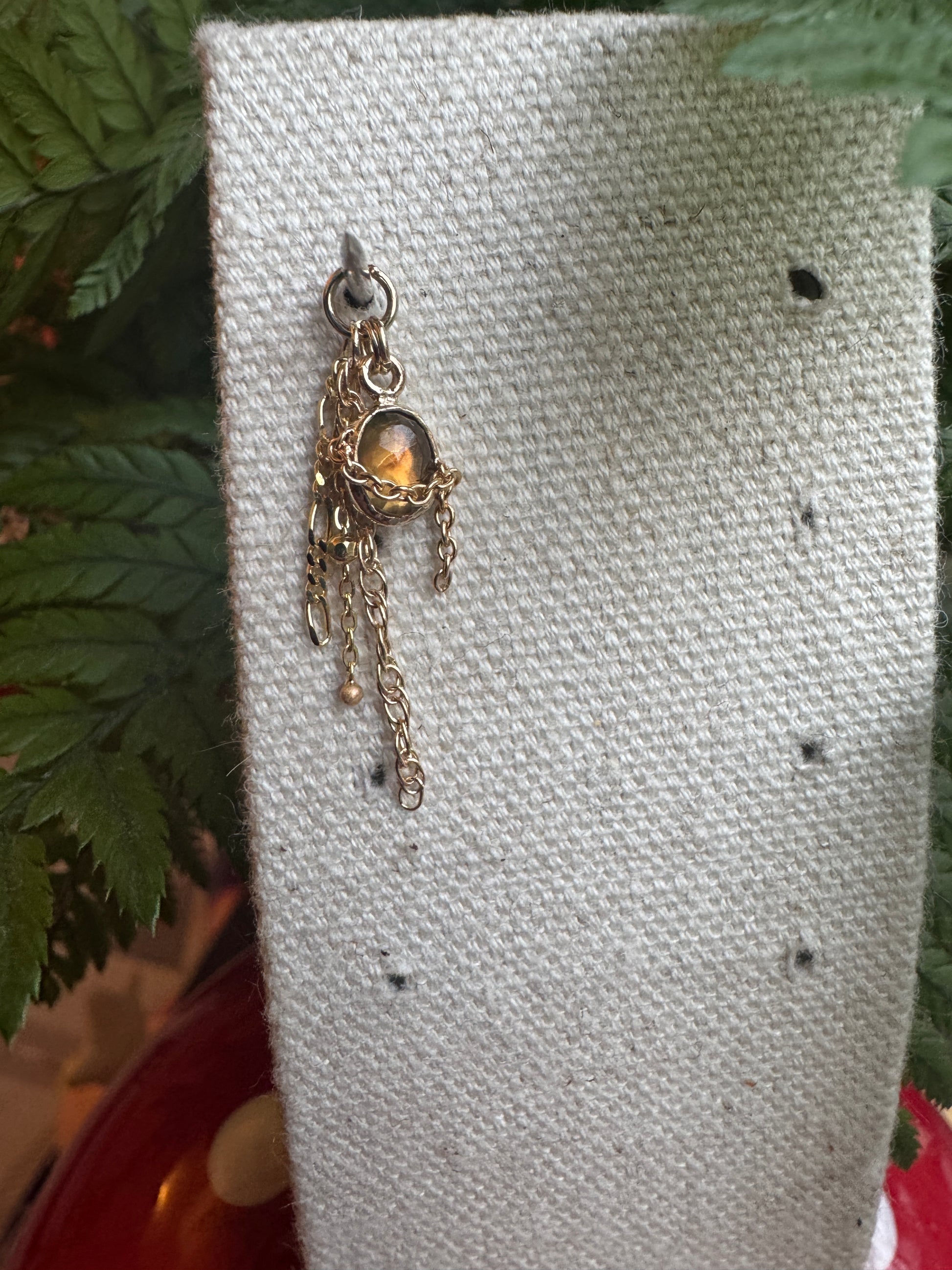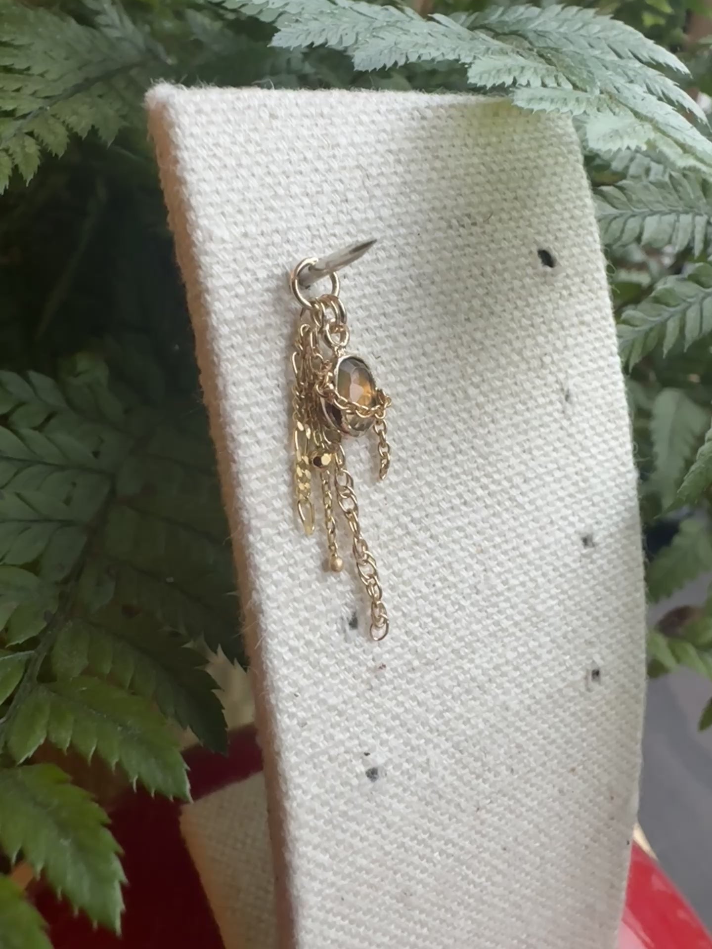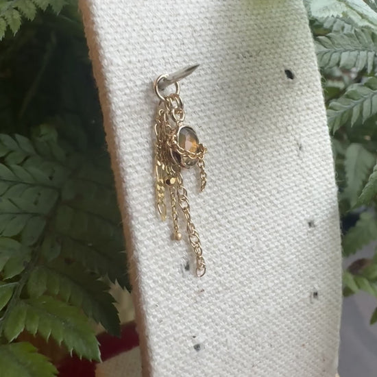 A beautiful 14k yellow gold bezel set mustard tone tourmaline with a little chain belt and trio of chain tassels