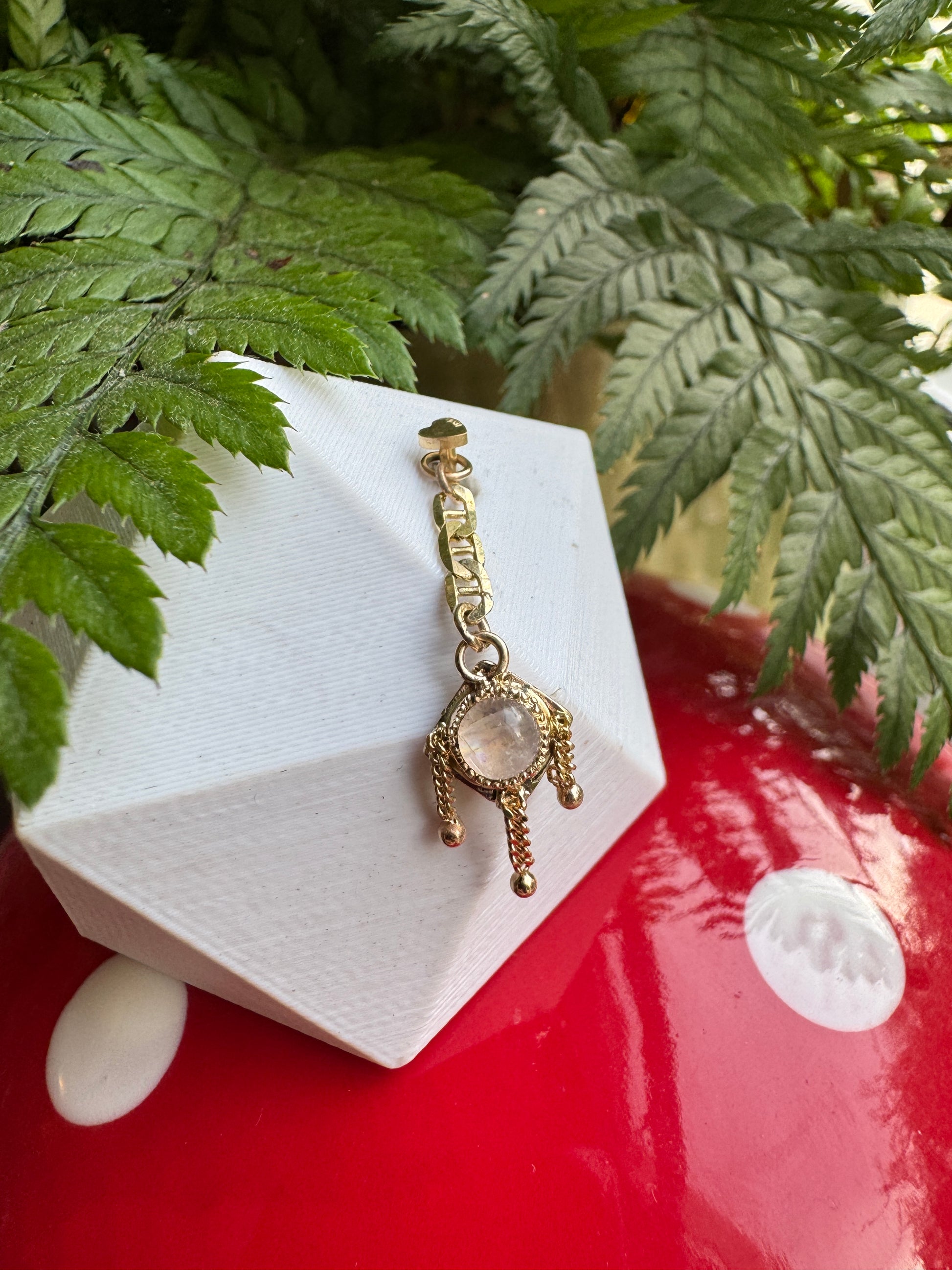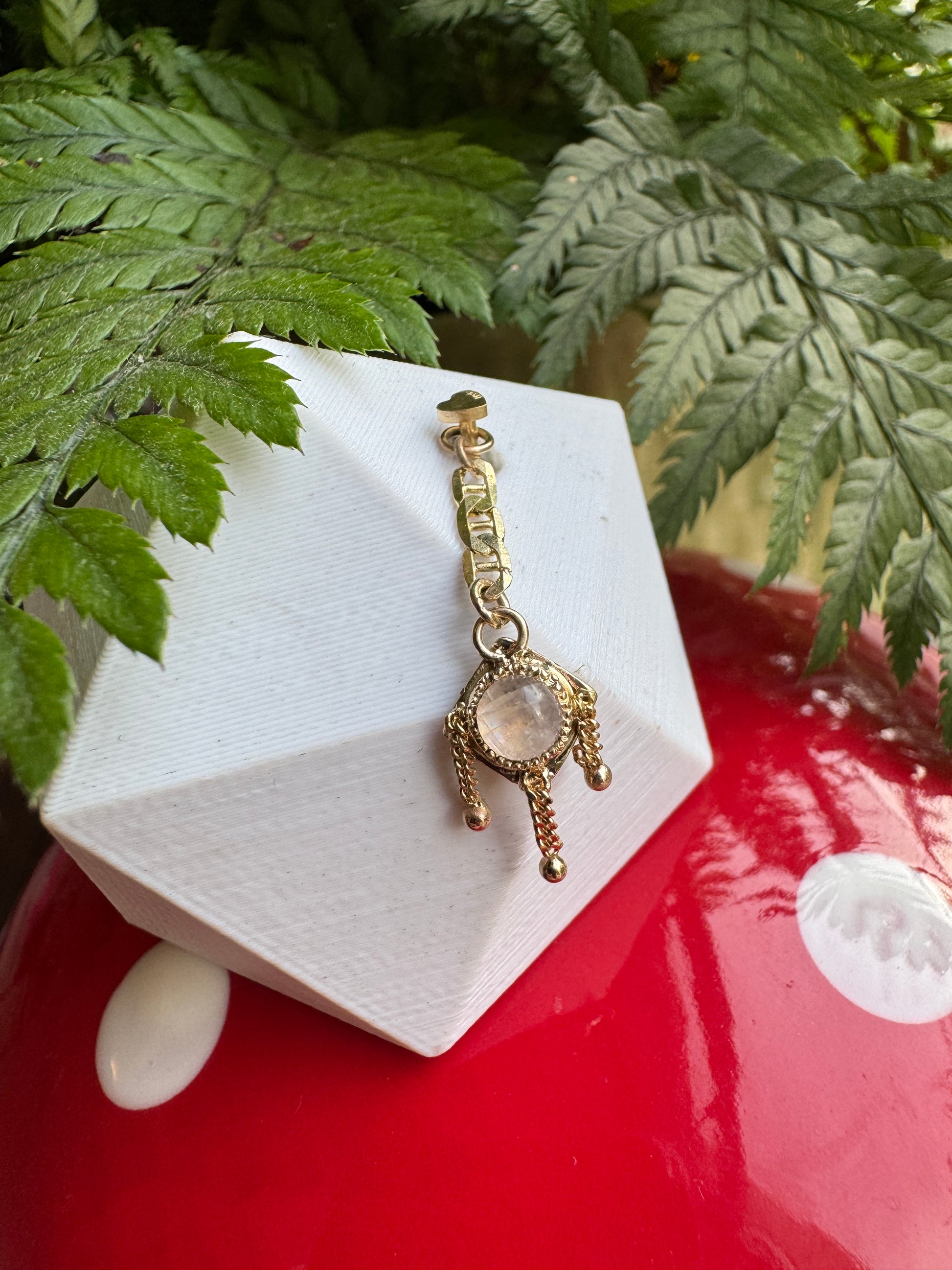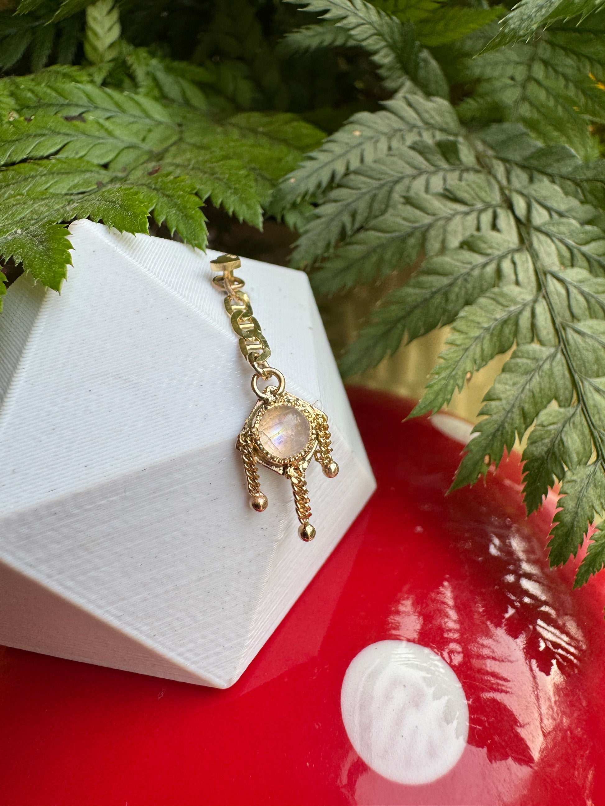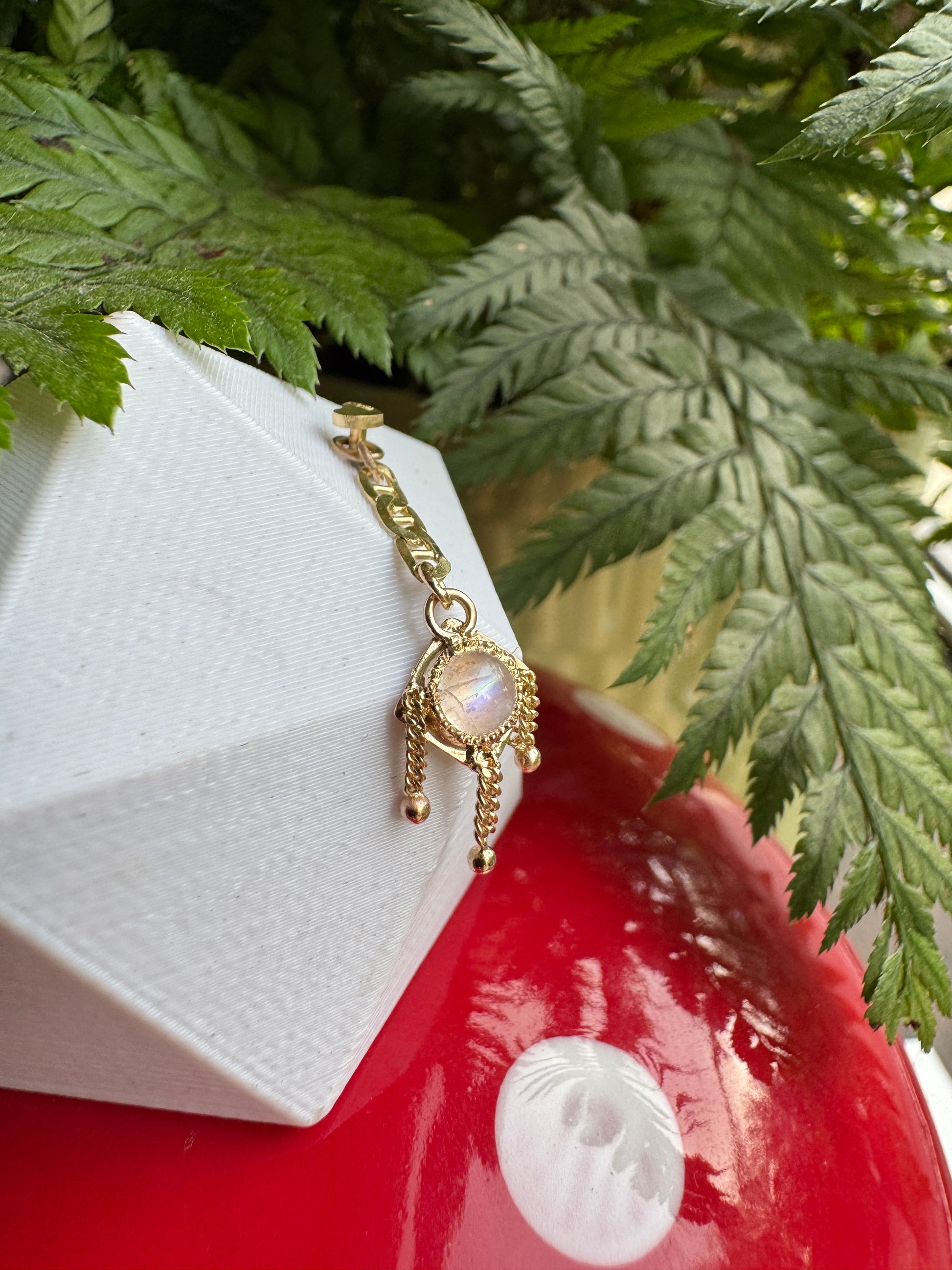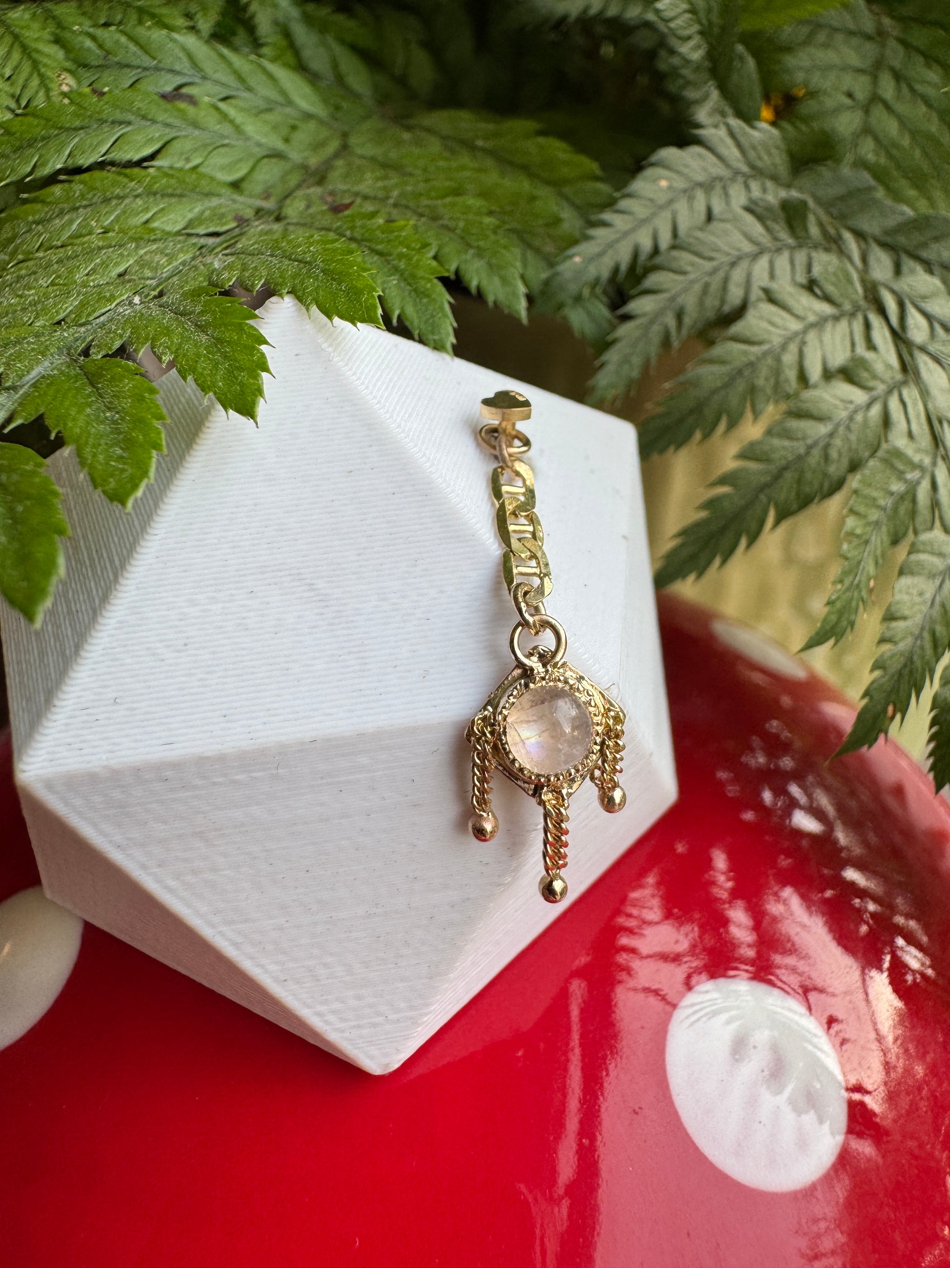 A beautiful rainbow moonstone bezel set with a square surround hanging from its axis. Drapes of curb chain and beads add a level of whimsy and the main body hangs from a trio of diamond cut anchor chain links. Perfect addition to any collection but would work really well to add as an extra layer.