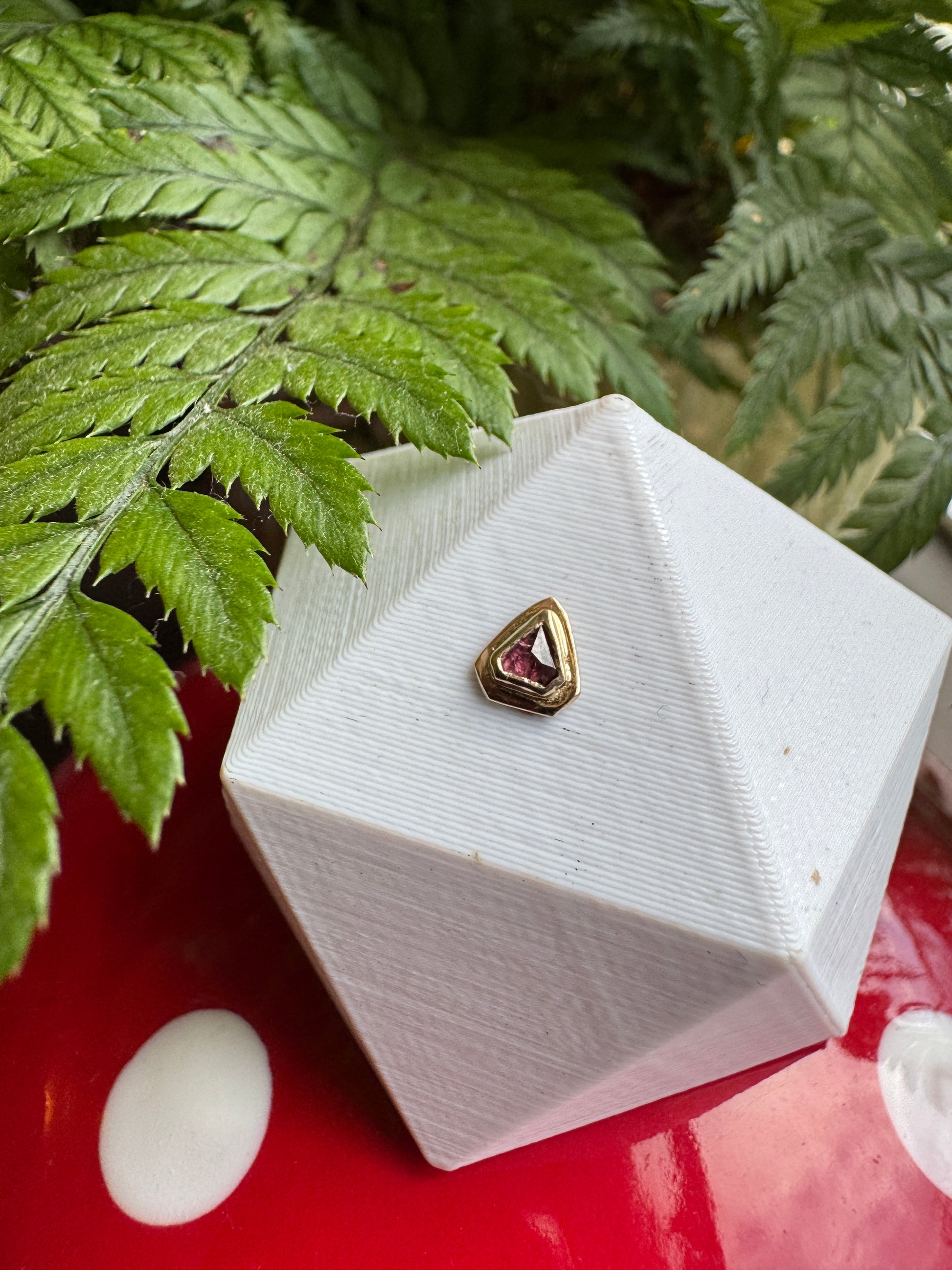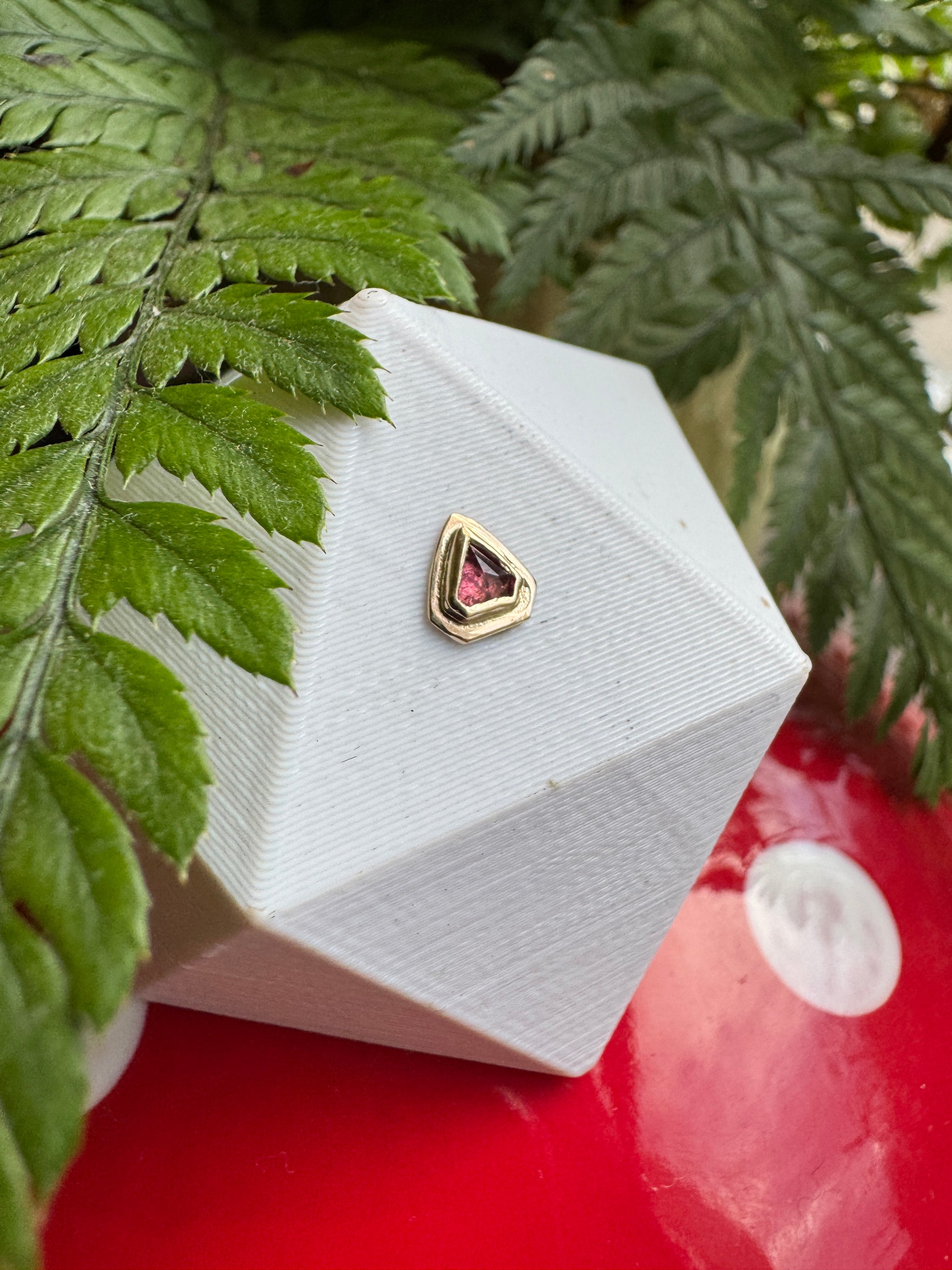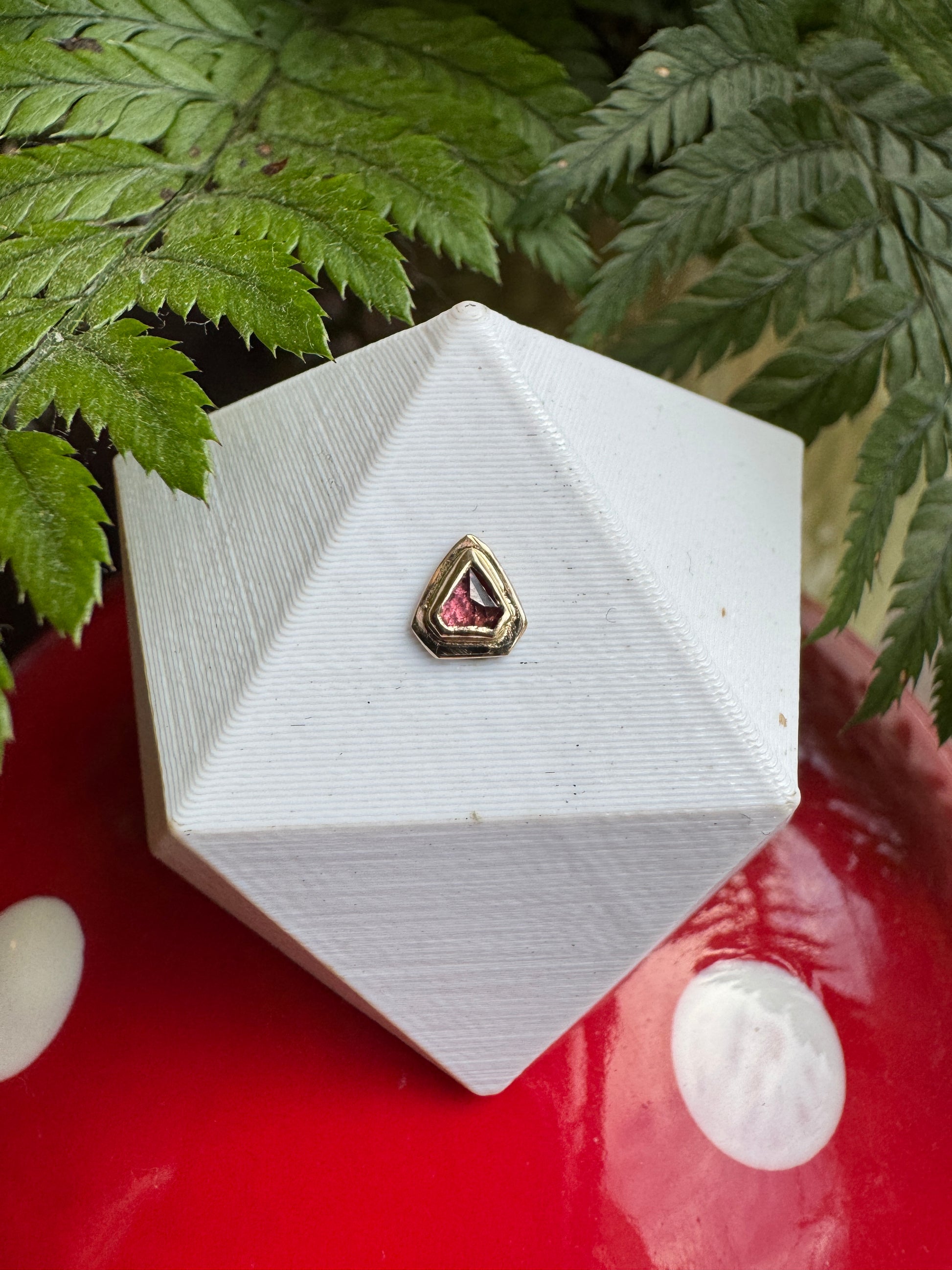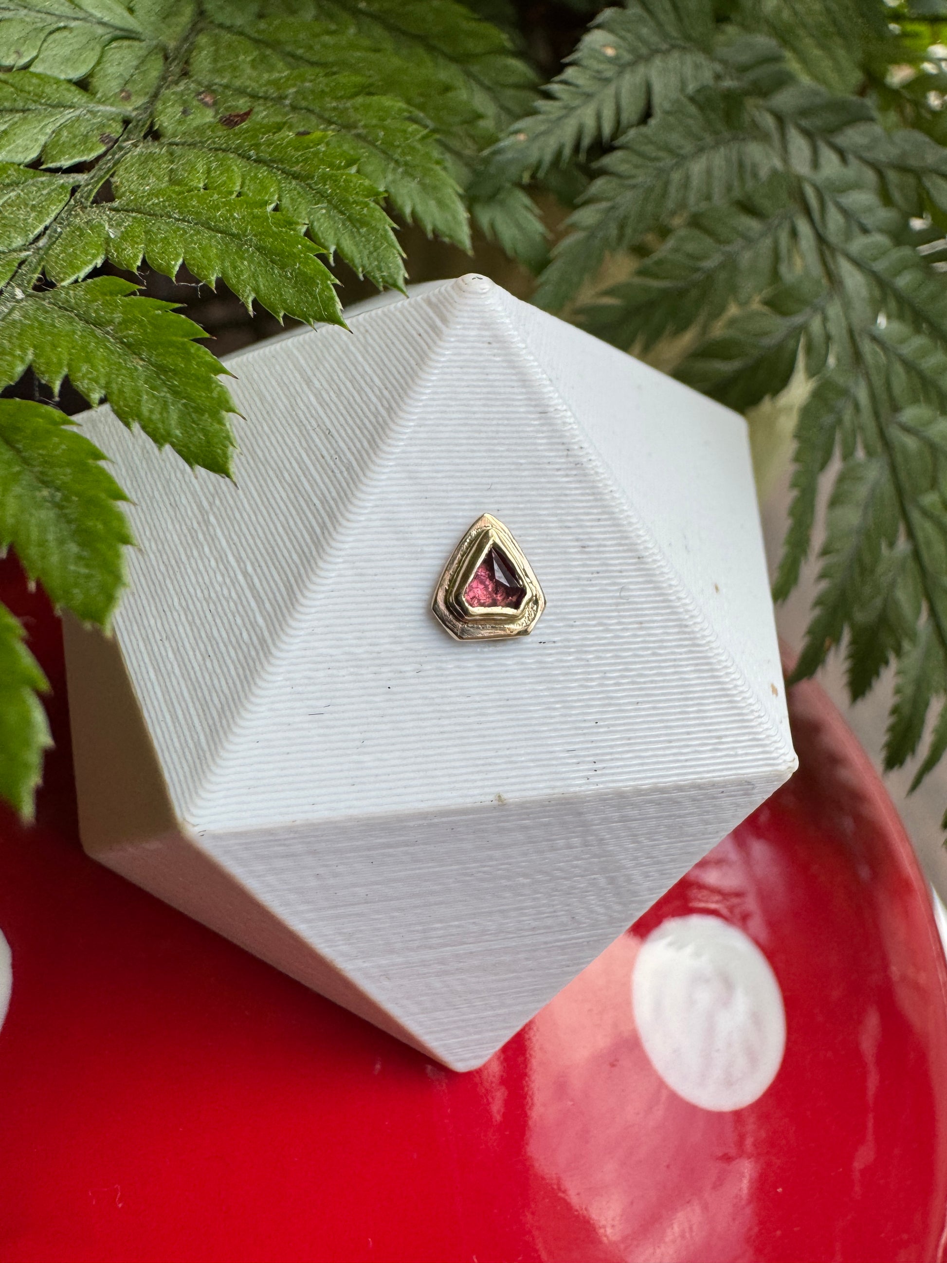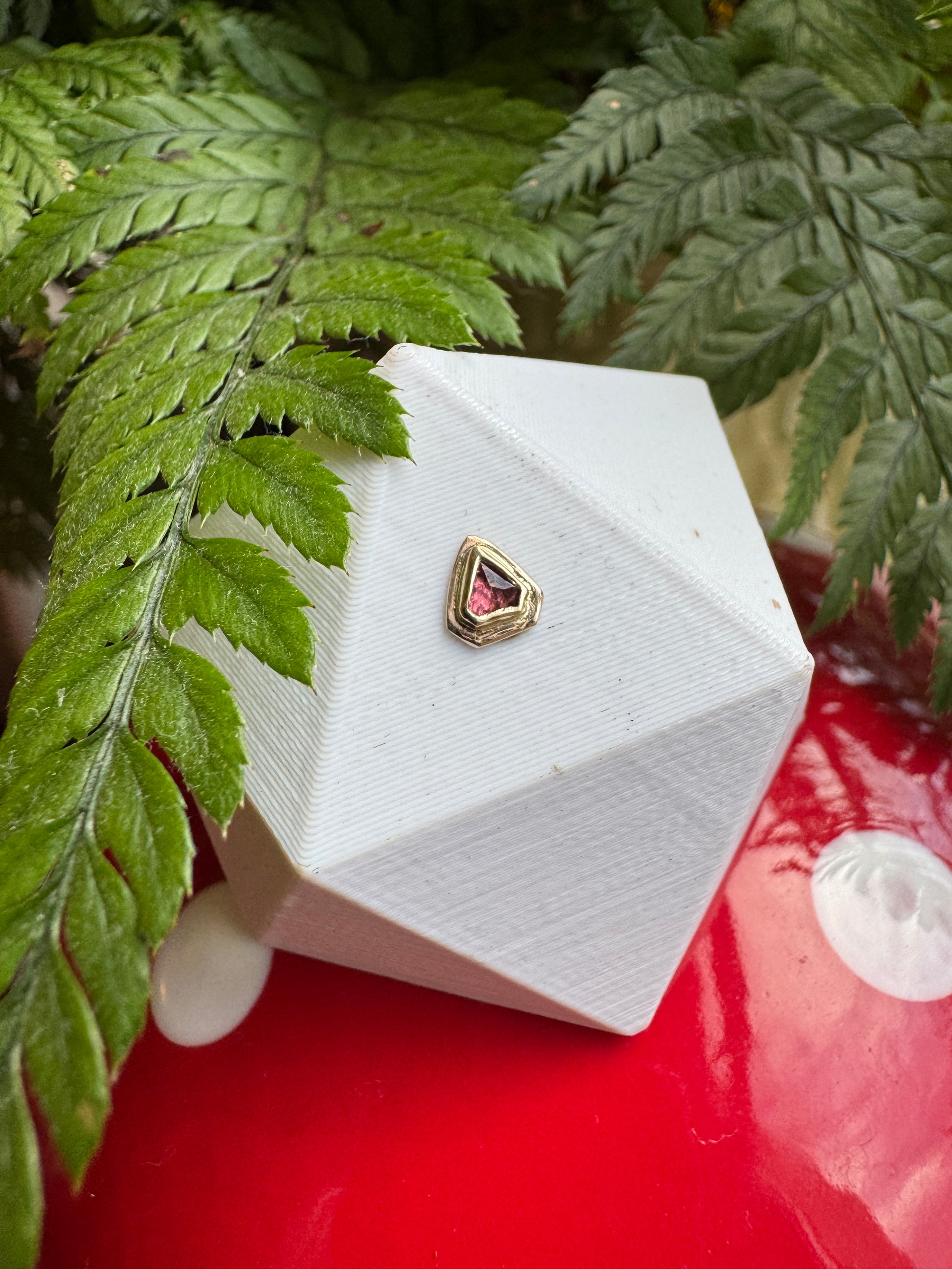 A solid 14k yellow gold bezel set ruby with a little high polished halo surround. Simple and wee - but mighty cute